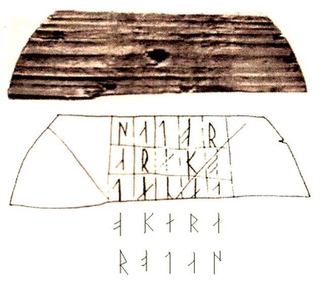 This appears to be some type of Latin phrase, and has puzzled many since it first started appearing. And appear it did, reaching a status some have described as memelike long before the intertubes began trading in such stuff. Its earliest appearances seem to have been on the Italian Peninsula, but it has been seen in France, Portugal, and as far away as England and Syria. There is even a runic inscription of the square Although somehow this has been characterized and spread across the internet as being a runestone, it is (as can be seen in the image, below) carved into wood—the bottom of a bowl of some kind, partly missing, but which doubtless finished the Square.