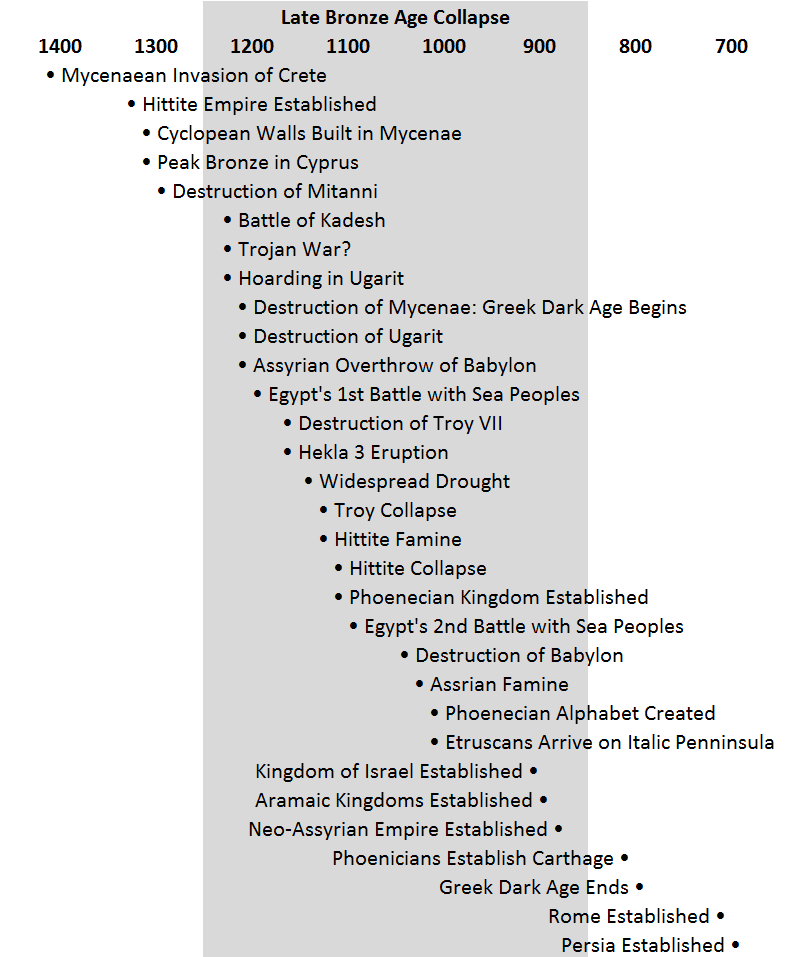 I only recently ran across the term Late Bronze Age collapse (LBAC). I had heard of the Greek Dark Ages (ca. 1100–ca. 750 BCE), the Fall of Troy, the Exodus (the historicity of which has not been established, but would fit into this context), and even the battles between the Egyptians and the Sea Peoples, which put an end to the New Kingdom period (ca. 1550 BCE–ca. 1077 BCE), but I hadn’t realized the extent to which these events were connected.